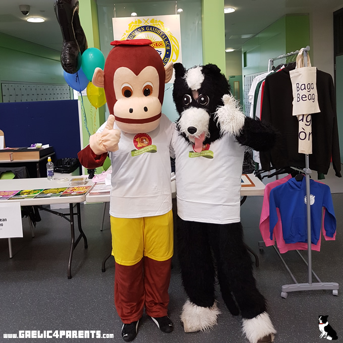 Nip and Maoilios are more than happy to come out to events —such as the 10th birthday celebrations held for Gaelic4Parents at the Royal National Mod in Stornoway in October.